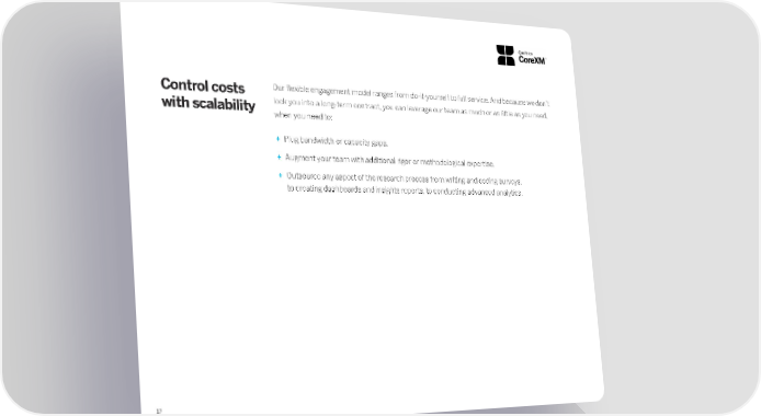 17 Control costs with scalability Our flexible engagement model ranges from do-it-yourself to full service. And because we don’t lock you into a long-term contract, you can leverage our team as much or as little as you need, when you need to: + Plug b andwidth or capacity gaps. + A ugment your team with additional rigor or methodological expertise. + O utsource any aspect of the research process from writing and coding surveys, to creating dashboards and insights reports, to conducting advanced analytics.