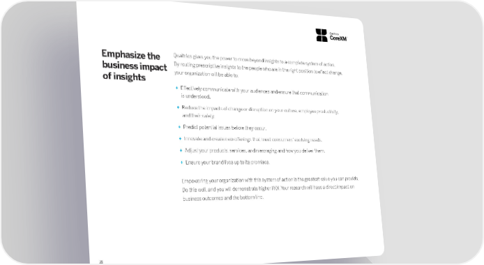 21 Emphasize the business impact of insights Qualtrics gives you the power to move beyond insights to a complete system of action. By routing prescriptive insights to the people who are in the right position to effect change, your organization will be able to: + Eff ectively communicate with your audiences and ensure that communication is understood. + R educe the impacts of change or disruption on your culture, employee productivity, and their safety. + P redict potential issues before they occur. + Inno vate and create new offerings that meet consumers’ evolving needs. + A djust your products, services, and messaging and how you deliver them. + E nsure your brand lives up to its promises. Empowering your organization with this system of action is the greatest value you can provide. Do this well, and you will demonstrate higher ROI. Your research will have a direct impact on business outcomes and the bottom line.